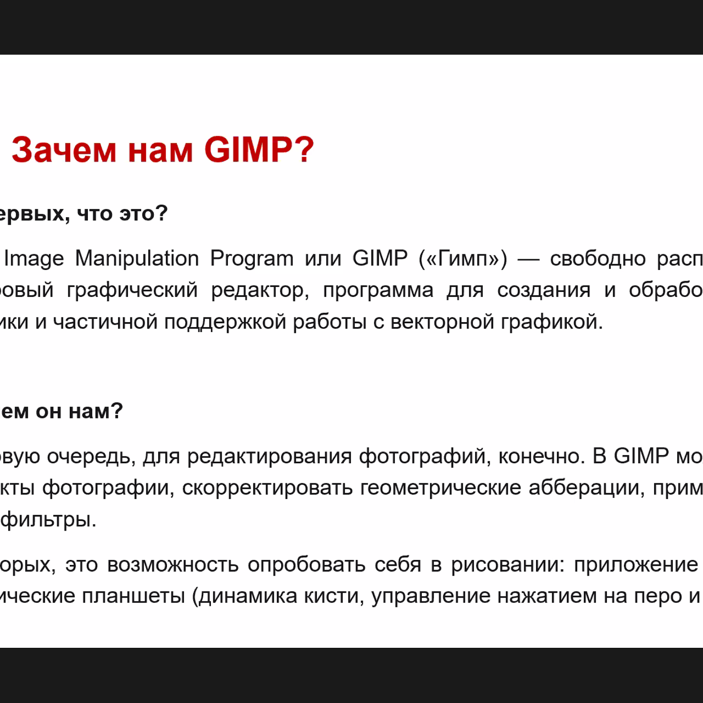 В ходе занятия участники узнали об особенностях растровых редакторах, их возможностях и отличиях от редакторов векторных. На примере программы GIMP ведущий продемонстрировал различные инструменты, способы редактирования и обработки фотографий, а также творческие приемы рисования, которые используют профессиональные художники в своей деятельности. В заключении мероприятия участникам были даны практические советы по эффективной работе с графическим материалом.