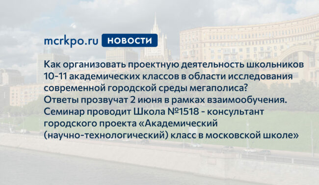 2 июня на взаимообучении пройдёт онлайн семинар «Современная городская среда как объект исследовательской и проектной деятельности для школьников из академических классов».