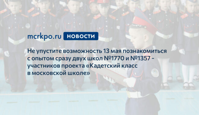 13 мая на взаимообучении школы №1770 и №1357 расскажут, как, используя ресурсы дополнительного образования, кадеты получают возможность выбора будущей профессии.